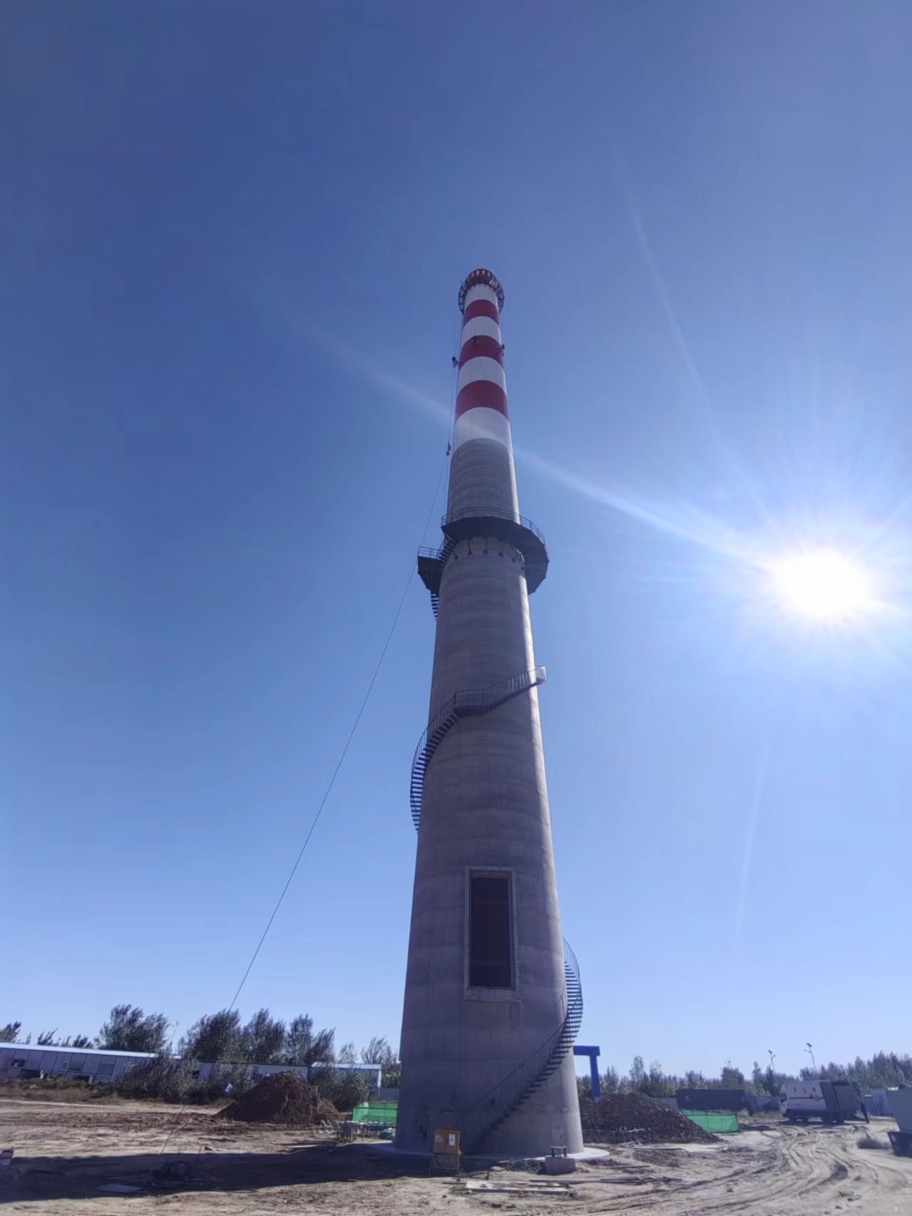 - 混凝土煙囪新建該混凝土煙囪新建工程的特殊性,在安全、快捷、方便的目標下,根據(jù)本公司現(xiàn)場考察,依托本公司雄厚的技術實力和豐富的高空作業(yè)的經驗,結合施工現(xiàn)場復雜的施工環(huán)境特制定如下施工方案